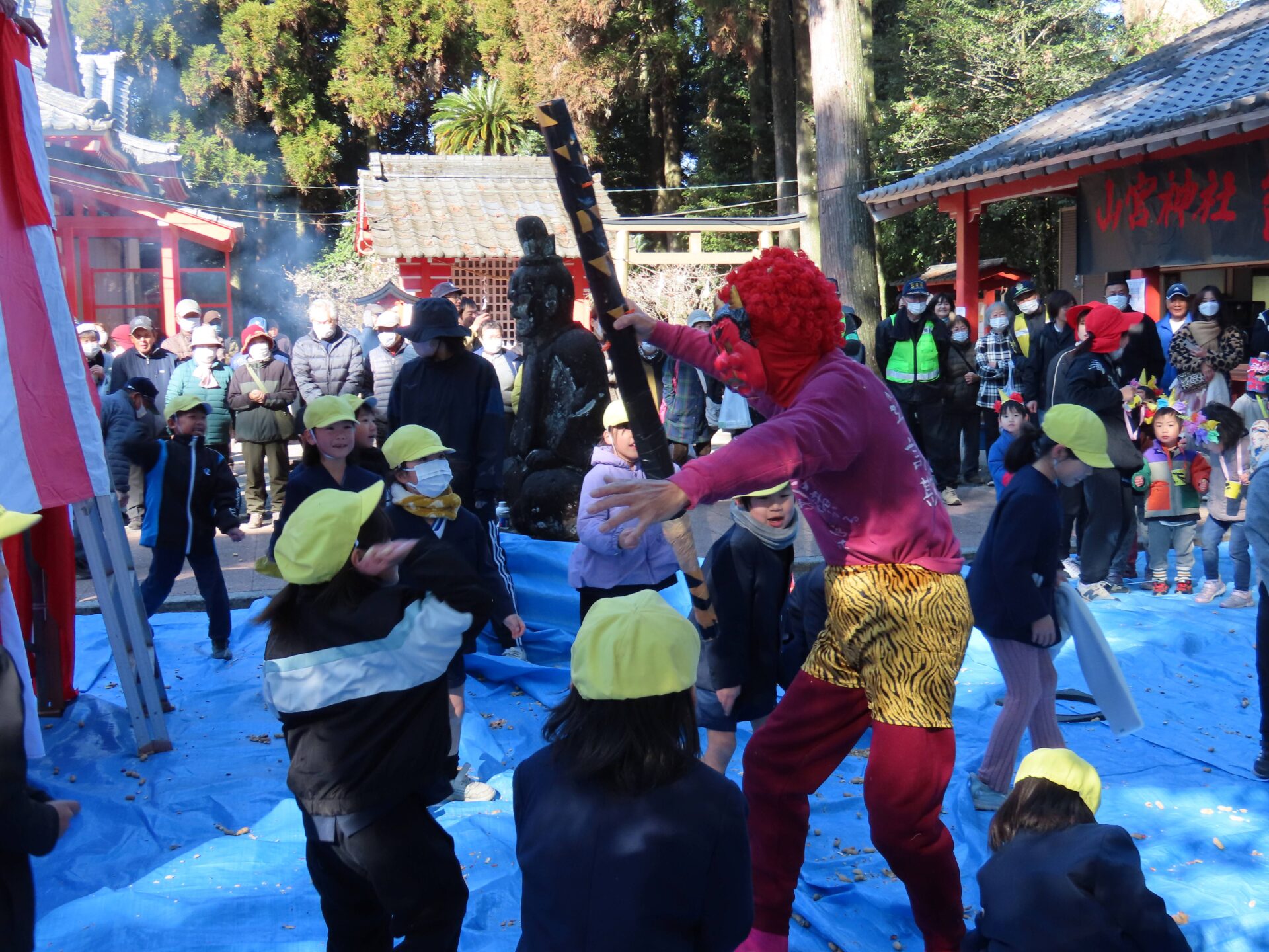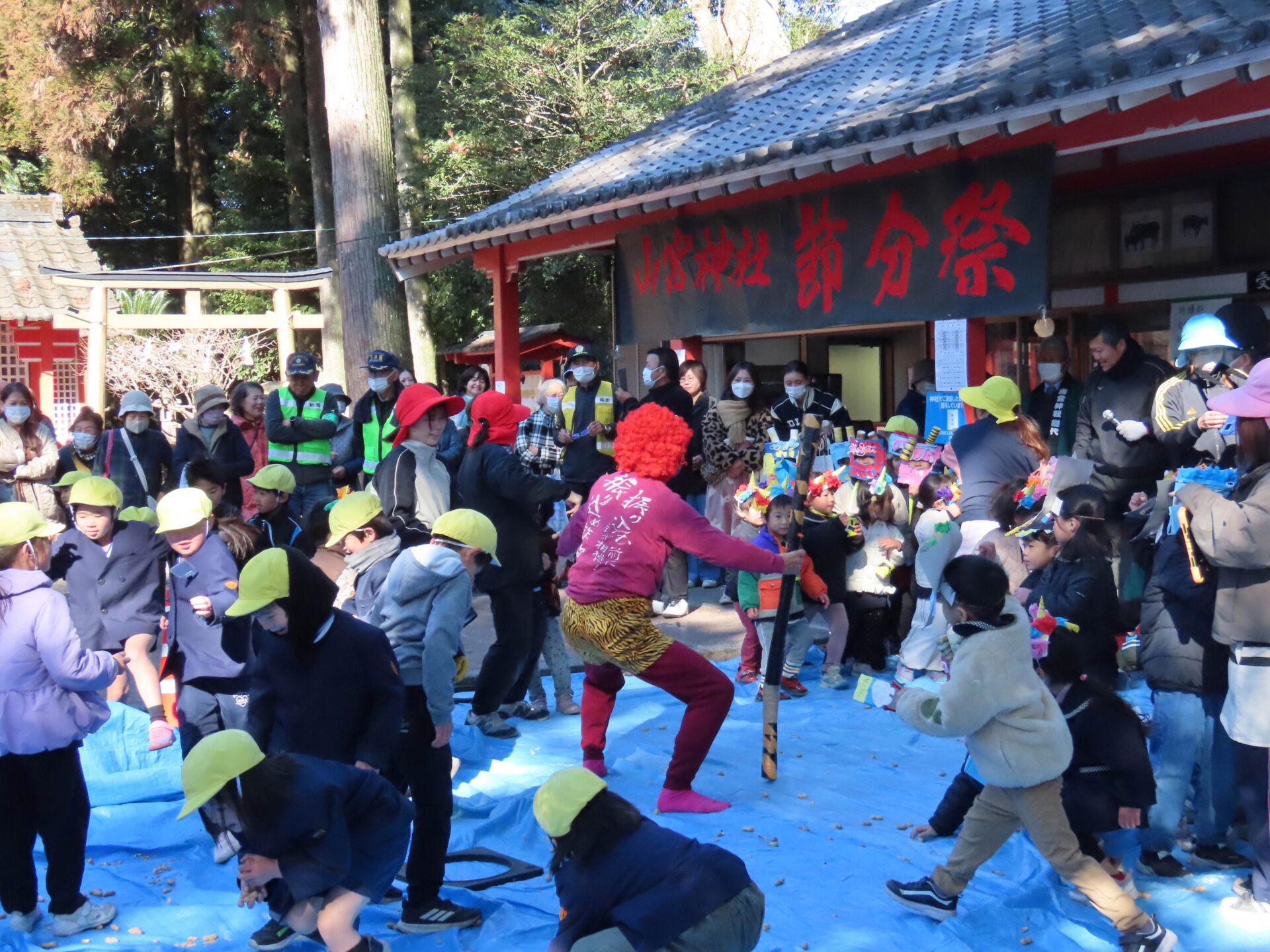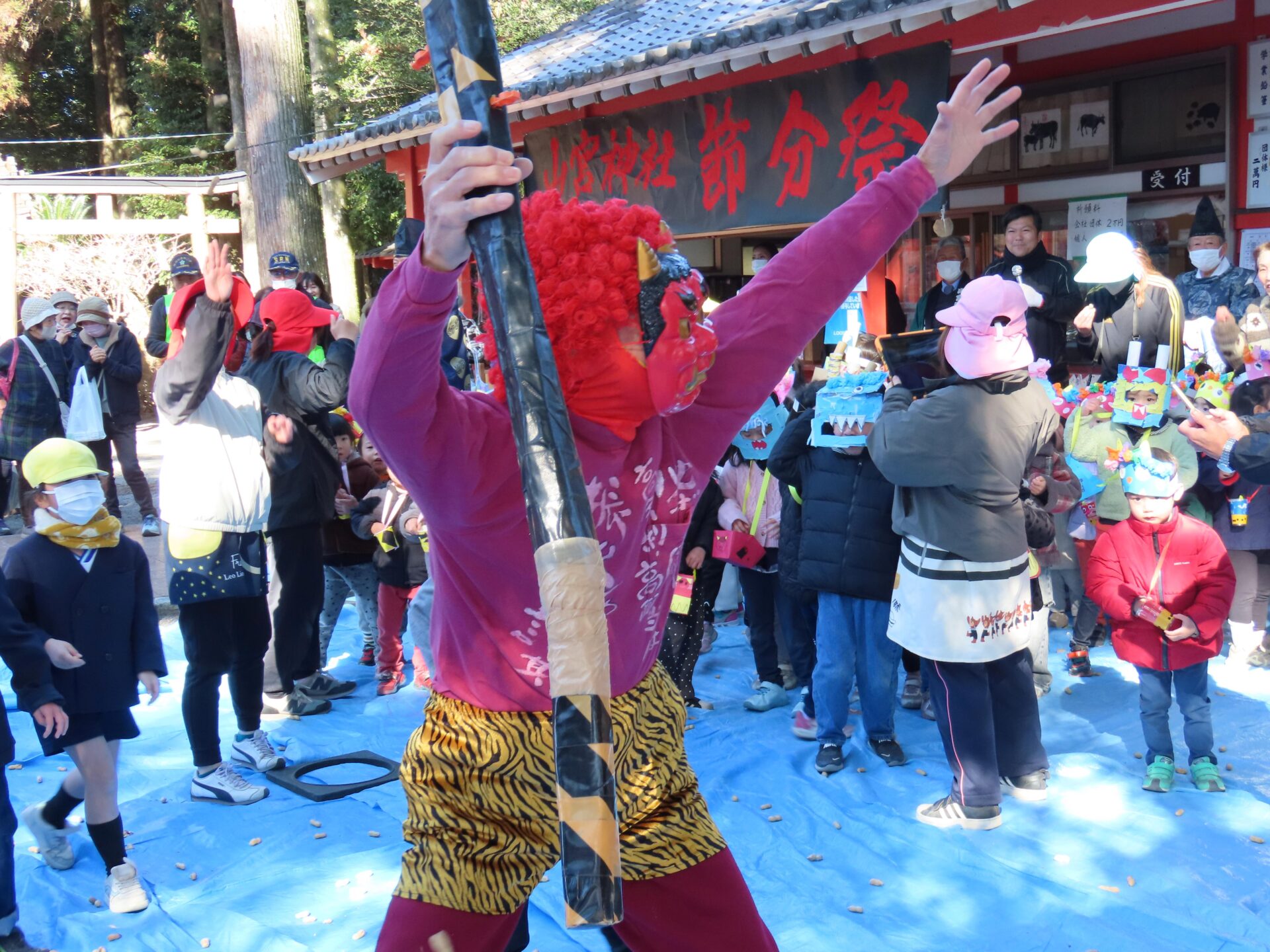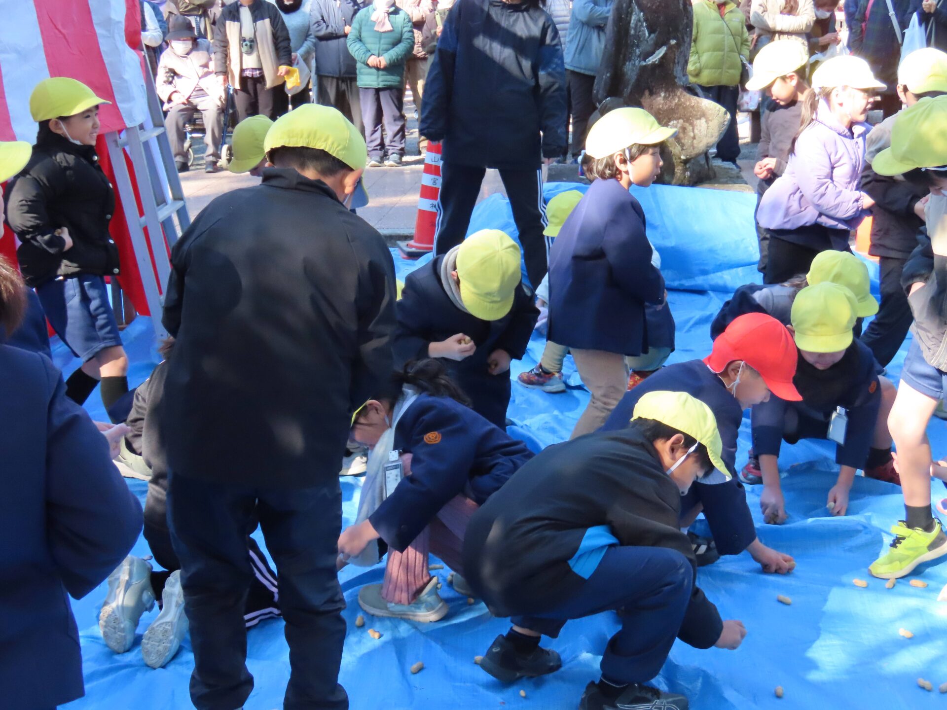 2/3 安楽山宮神社節分祭 作成者 anrakusyou_admin公開日 2026年2月3日 本日は節分。 学校近くの安楽山宮神社でも節分祭が開催されました。 この節分祭には毎年,1年生が招待されているとのこと。 今年も節分祭に行ってきました!! はじめに鬼を退治するため,豆をたくさん拾います。 ポケットや両手にいっぱいになったところへ鬼の登場!! 豆を投げて一生懸命鬼退治をしました。 自分たちの中の「泣き虫おに」や「忘れ物おに」などもきっと退治できたことでしょう。 今年の恵方は南南東。 今日は恵方巻きを食べて節分を楽しみ,家族みんなの幸せを願ってくださいね。