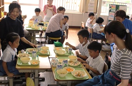 まずは給食試食会です。1年生と一緒に給食を食べていただきました。
