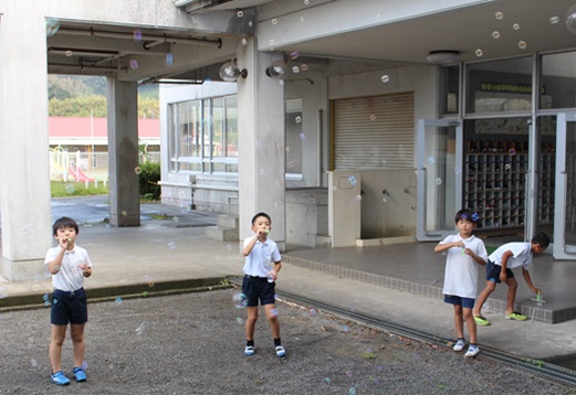 改めてシャボン玉が飛んできた外の方を見てみると、「ほらっ、大きいのができたよ、見て!」「本当だ。大きい大きい。」と弾むような声でおしゃべりしながらシャボン玉飛ばしを楽しむ子どもたちの姿が見えました。