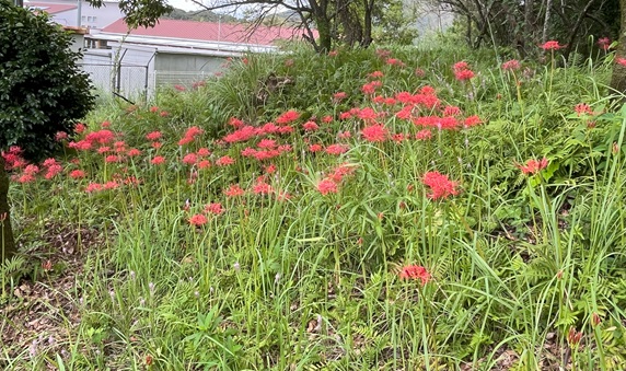 暑い毎日が続いていますが、自然は季節の移り変わりをちゃんと知っています。秋のお彼岸が近付くと、有明小学校にはたくさんのヒガンバナが咲き始めます。そして、お彼岸の中日あたりには見頃になります。