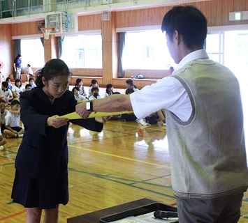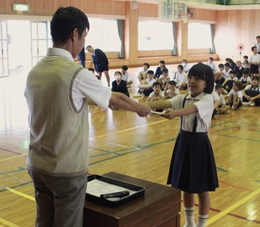 次に、志布志市陸上記録会で上位に入賞した児童、 また、曽於地区の「健康に関する標語」の特選、吉川愛琉さんの表彰を行いました。