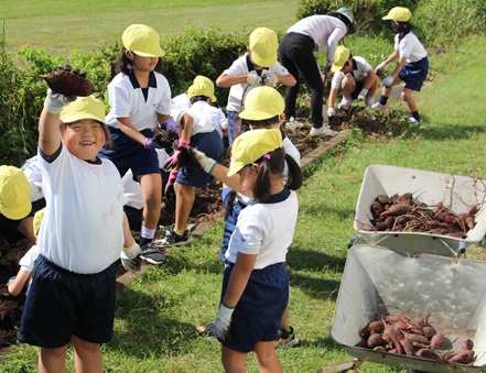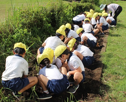 松木田先生が畑の土をやわらかくした後、1年生がみんなで力を合わせて畑の土を掘っていくと…、土の中から大きな大きなサツマイモが出てきました。
