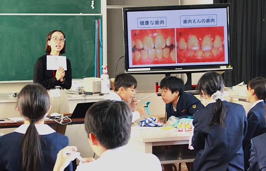 6年生のテーマは「歯肉炎・歯周病を予防しよう」で、歯肉炎や歯周病を知り、予防するための歯磨きについて学習しました。