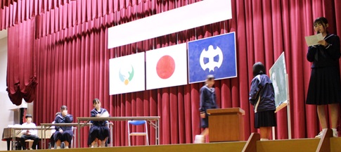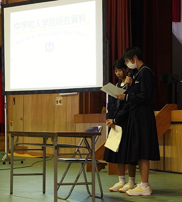 校長先生があいさつの中で、令和7年の入学予定者は49人で、2学級になる予定だと話されました。次に、生徒会による学校生活の紹介や生徒指導担当の深水先生の話がありました。劇仕立てにした中学校生活は分かりやすかったです。