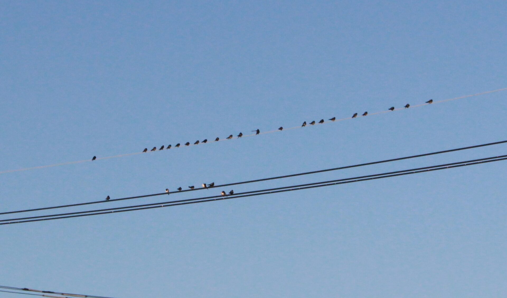 気温が5℃という寒い朝、いつものように7時40分から正門に立ちます。ずいぶん前から気になっていたのですが、日の当たる電線に、20~30羽の小鳥の姿。背中を向けているのはきっと、朝日を背中に受けて日向ぼっこ?