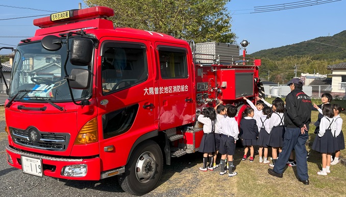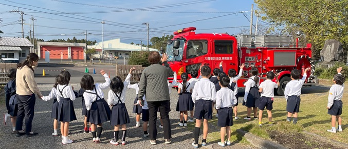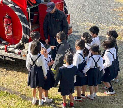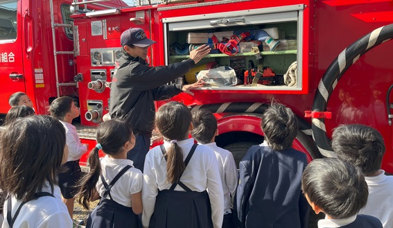 避難訓練の後、1年生は消防士の皆さんに消防車の説明をしていただきました。