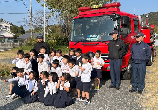といった具合に、1年生は消防士さんに質問を続けました。国語の「じどう車くらべ」でいろいろな自動車の「しごと」と「つくり」について学習し、「じどう車ずかん」をつくった1年生の消防車に対する質問はなかなか鋭かったです。