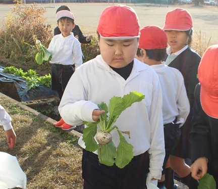 1月17日(金)の2校時、ちょっと外がにぎやかになりました。2年生が学年園の野菜の観察をしているようでした。ちょっとのぞいてみると…。