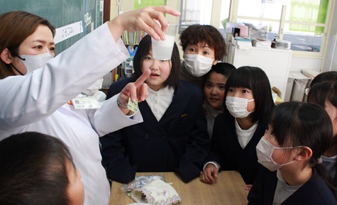 富永先生は、薬には飲むタイミングや飲む量が決まっていること、薬には大切なルールがあって、飲み合わせによって味が変わってしまうことがあることなどを、化学の実験のように目の前で変化を見せながら、分かりやすく3年生に教えてくださいました。