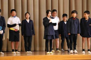1月28日(水)の児童集会は、健康委員会が「かぜの予防」をテーマにした劇を発表しました。バイ菌マンたちと予防レンジャーの愉快なやり取りを通して、手洗いや換気、咳エチケットの重要性、そしてハンカチを持ち歩くことなど、日常生活での正しい習慣を楽しく学ぶことができました。