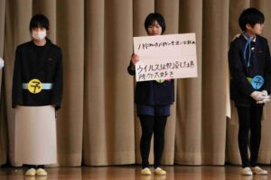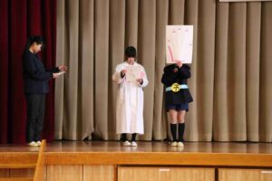 1月28日(水)の児童集会は、健康委員会が「かぜの予防」をテーマにした劇を発表しました。バイ菌マンたちと予防レンジャーの愉快なやり取りを通して、手洗いや換気、咳エチケットの重要性、そしてハンカチを持ち歩くことなど、日常生活での正しい習慣を楽しく学ぶことができました。