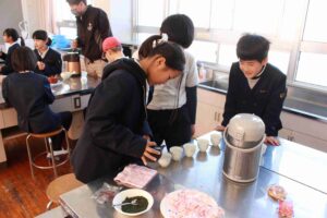 2月4日(水)の3校時、5年生は若葉会から5人の先生をお迎えして、お茶との触れ合い事業を実施しました。この事業は、実際の急須と湯のみを使用して、鹿児島県産のおいしいお茶の入れ方を学ぶ体験学習です。