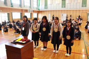 2月4日(水)の全校集会では、そろえて☆はっぴぃカード 表彰式を行いました。 本校では、2学期から「トイレのスリッパをそろえよう」を合言葉に全校で取り組んでいます。自分が使ったトイレのスリッパを含め、そろえた数だけカードに○を付けていきます。100個そろえたら銅メダル、200個そろえたら銀メダル、300個そろえたら金メダル、1000個そろえたらビッグ金メダルがもらえます。 いつ見てもトイレのスリッパがそろっており、気持ちがいいです。