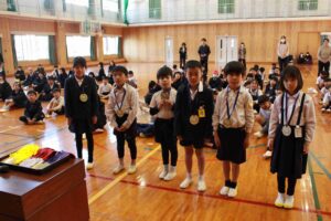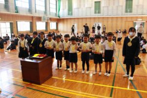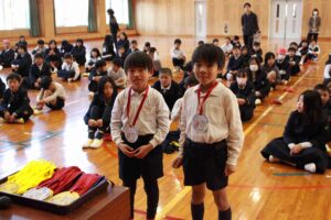2月4日(水)の全校集会では、そろえて☆はっぴぃカード 表彰式を行いました。 本校では、2学期から「トイレのスリッパをそろえよう」を合言葉に全校で取り組んでいます。自分が使ったトイレのスリッパを含め、そろえた数だけカードに○を付けていきます。100個そろえたら銅メダル、200個そろえたら銀メダル、300個そろえたら金メダル、1000個そろえたらビッグ金メダルがもらえます。 いつ見てもトイレのスリッパがそろっており、気持ちがいいです。