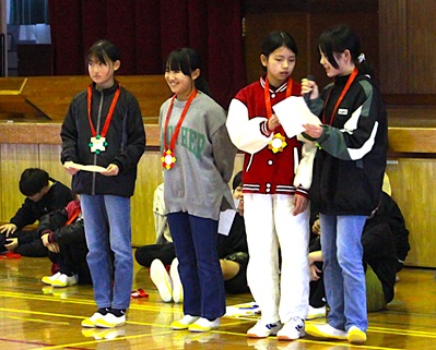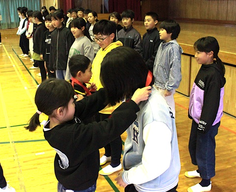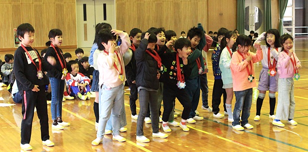 1年生は、感謝の気持ちを言葉と「アイアイ」の替え歌で贈り、メダルをプレゼントしました。