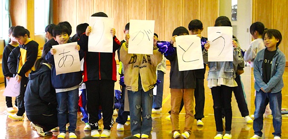 2年生は、6年生に「えがお」「いっしょうけんめい」「でっかい」「ありがとう」の言葉を贈り、鍵盤ハモニカの演奏をプレゼントしました。