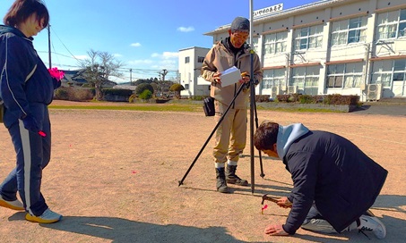 2月18日(火)の午後、測量機器と共に、創立150周年の記念撮影の準備が開始されました。明日、校庭に、「あ・り・あ・け」の文字を全校児童でつくります。創立150周年記念事業実行委員会のメンバーがポイントにマーカーを打ち込みます。