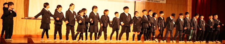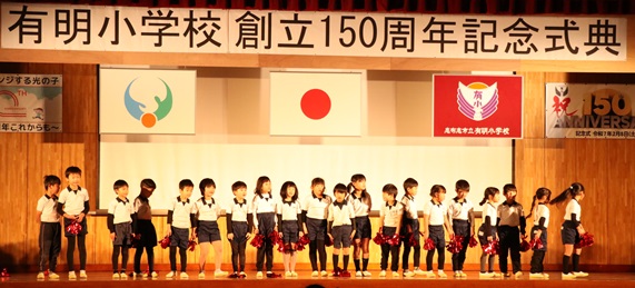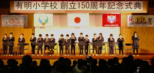 その後、会場の全員で校歌を斉唱し、最後は岩屋 高広 前有明小学校長の発声で、万歳三唱。盛会のうちに、創立150周年記念わくわく発表会を閉会しました。