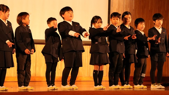 2年生は「明日へジャンプ」の発表で、生まれる前からと生まれてからのこれまでの成長を振り返って、今、2年生でできるようになっていることを披露し、たくさんの人のお世話になってきたことを感謝しました。