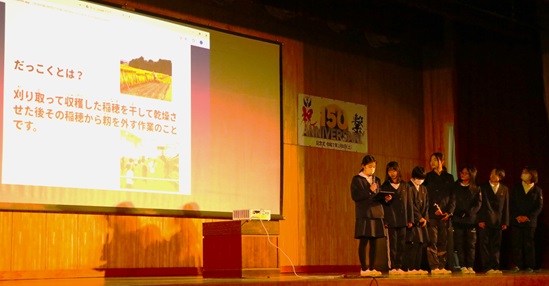 5年生は苗作りから取り組んだ「米づくり」の様子を発表しました。