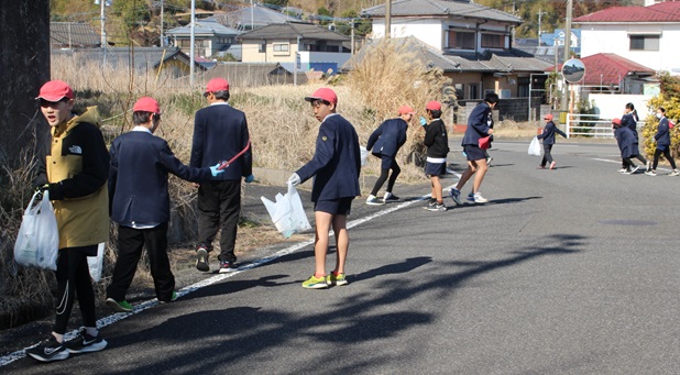 1月31日(金)の3校時、6年生は学校のまわりの清掃活動に出かけていきました。