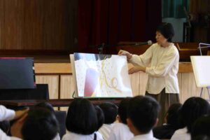 11月7日(金)、道徳教育の一環として全校児童で命と平和の学習会を行いました。今回は、図書館ボランティア「がんがらの会」の方々4名をお招きし、紙芝居「そのときわたしは10才でした」の他、パネルシアターや大型絵本等の読み聞かせをしていただきました。