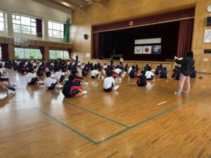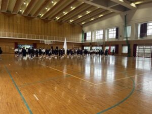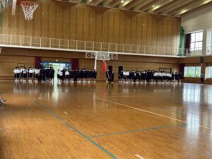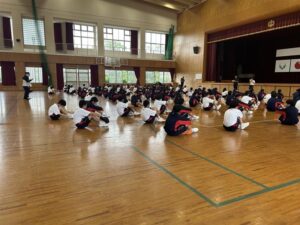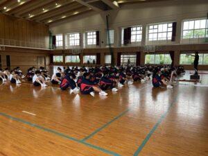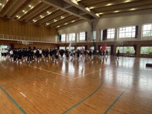 今日の5時間目も体育大会練習でした。今日は,あいにくの雨でグラウンドが使えず,体育館での練習でした。今日は開閉会式の練習を中心に行いました。保体部副部長の笛の合図で,きびきび動けていました。次回は,係の連携の確認がメインなので,外で行えるといいですね。