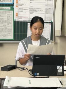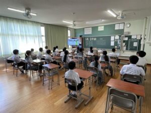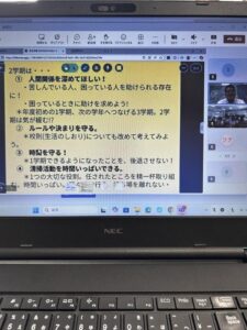 暑く長かった夏休みが終わり,2学期がスタートしました。今朝は,朝の会,大掃除の後,リモートによる始業式が行われました。教頭先生の開式の言葉に続いて,学年と生徒会代表の4名が,夏休みを振り返っての反省と,2学期の抱負を述べてくれました。その後,校長の話をパワーポイントを使って行い,校歌斉唱の後,閉式の言葉で終わりました。続いて,進路指導主任と生徒指導主任から話があり,始業式と連絡を終わりました。今日は,久しぶりに会う友達と,夏休みの話で盛り上がったことでしょう。一日も早く学校モードに切り替えられるように頑張っていきましょう!