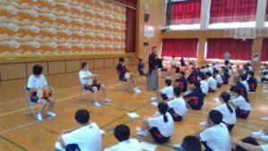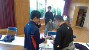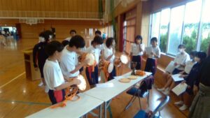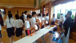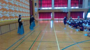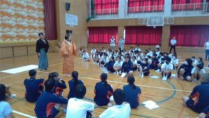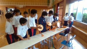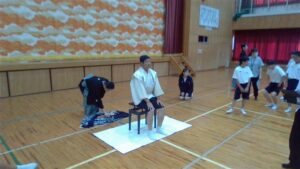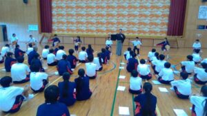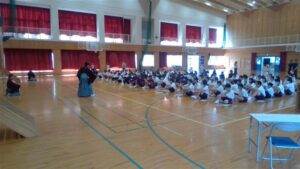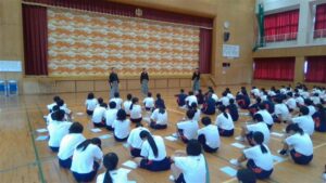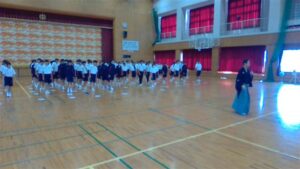 今日の2・3校時は,芸術鑑賞教室でした。今日は,能楽の先生方を3名お招きして,ワークショップを交えながら,能楽に触れる体験をしました。本校のK教諭が能装束の着付けをしたり,全員ですり足の体験をしたり,代表の生徒が大鼓を体験したりと盛りだくさんでした。最後に,迫力ある舞「敦盛」を鑑賞しました。最後に,文化部長のSさんが,お礼の言葉を述べ,また有明中に来て下さいと締めくくりました。