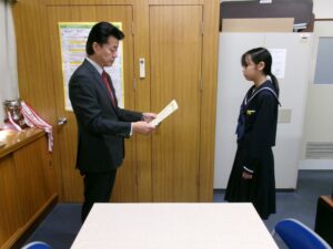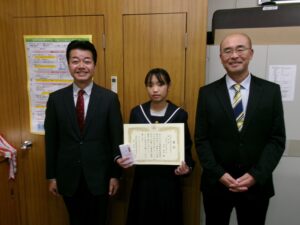 本日,曽於地区納税貯蓄組合連合会の方がお二人お見えになり,本校のSさんが,「全国納税貯蓄組合連合会並びに国税庁が実施する税についての作文」において,優良賞を獲得したとのことで,賞状と賞品を渡してくださいました。夏休みに書いた作文で,本人もびっくりしていました。税について,自分で調べてまとめたとのことで,うれしい受賞となりました。おめでとう!