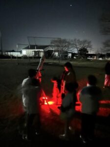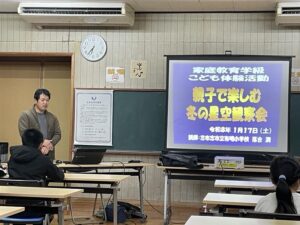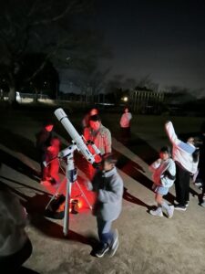 その後,有明小の校庭に移動して,天体望遠鏡を使って,観察を行いました。絶好の快晴で,月も出ておらず,冬の大三角や土星,木星などきれいに観察することができました。