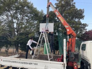 校庭のバスケットリングのボードを補修していただきました 作成者 ariaketyuu_admin公開日 2026年1月19日 今日の午後,本校保護者のAさんに,校庭のバスケットリングのバックボードを補修していただきました。UNICも使いながら,手際よく補修していただきました。これでしばらくは,大丈夫かと思います。生徒の皆さん,昼休みに是非活用してください。