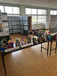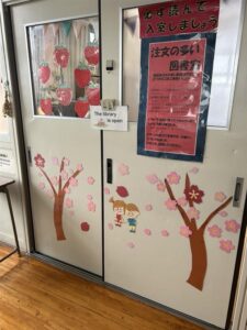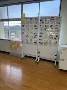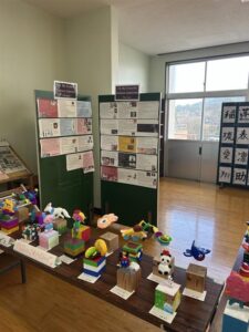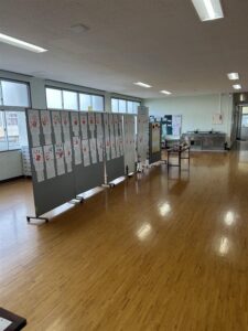 有明中学校の2階のオープンスペースは,今展示物が非常に充実しています。美術や書道,英語,総合的な学習などの作品でいっぱいです。また,図書室の前は,ひな祭りにちなんだ展示物が飾られています。学校にお越しの際は,是非ご覧いただければと思います。