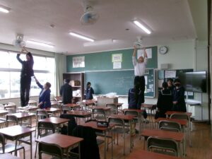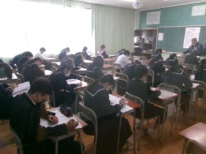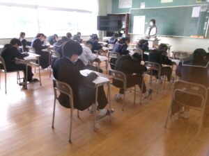 公立高校入試2日目になりました。受検生の皆さんは,最後に力を振り絞って,頑張ってほしいです。さて,本校でも1・2年生は,実力テスト2日目を迎えました。みんな真剣表情で問題に取り組んでいました。