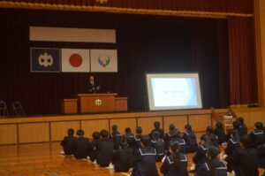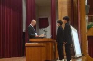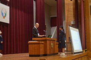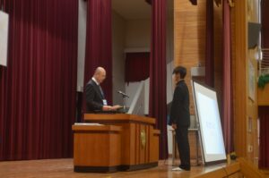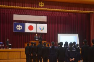 今日は,今年度最後の登校日で,修了式と最後の学活,離任式が行われました。修了式に先立ち,授賞伝達式が行われ,弓道部男女の活躍や志の言の葉スピーチコンテスト,標語等の受賞伝達を行いました。来年度もたくさんの受賞伝達ができることを楽しみにしています。
