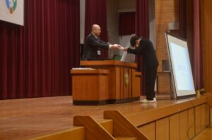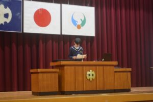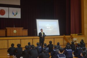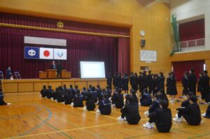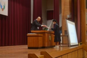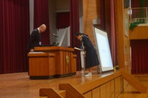 引き続き行われた修了式では,まず各学年の代表に修了証書を手渡しました。その後,各学年と生徒会代表による発表を行いました。1年代表のNさんは,小学校時代仲の良かった友だちと別れましたが,新しい友だちができ楽しく過ごせたと発表してくれました。2年代表のF君は,2年では駅伝大会を特に頑張った。来年度は受験生になるので,クラス一丸となって受験生らしい雰囲気を作っていきたいと決意を述べてくれました。生徒会代表のIさんは,生徒会生活部長として良かった点と悪かった点を振り返ってくれました。今年度は,生徒会担当の先生に頼る所があったので,来年度は自分たちで自主的に動いていきたいと決意を述べてくれました。校長の話では,スライドで1年間を振り返りながら,成長した点を挙げていきました。来年度は更にレベルアップすることを期待して話を終えました。最後の校歌斉唱では,1・2年生だけでしたが,大きな声で歌うことができました。式終了後は,生徒指導主任より全国で相次いだSNSへの暴力動画投稿の危険性などについて,動画を活用しながら指導が行われました。春休みも安全面に気を付けながら,充実した休みを過ごしてほしいと思います。