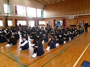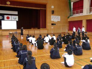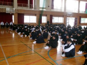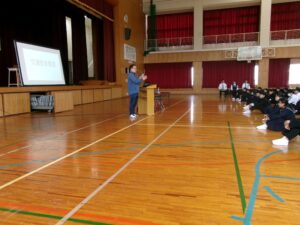 今日の6校時は,体育館で交通安全教室でした。志布志警察署他から3名の警察官の方々にお越しいただき,自転車の乗り方を中心にお話ししていただきました。その前に,安全指導担当のY先生から自転車通学規定についての説明も行いました。講評では,毎年4月は自転車事故が多いから,十分気を付けるようにと念を押しました。最後に,生徒会生活部長のIさんがお礼の言葉を述べました。気を引き締める意味でも,良い時間になったと思います。交通安全教室の後は,警察官も交えて,自転車点検をしてもらいました。今日お越しいただいた3名の皆様,ありがとうございました。