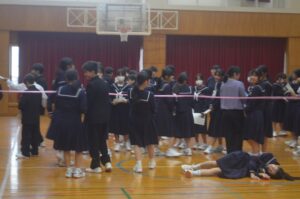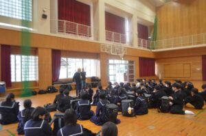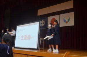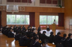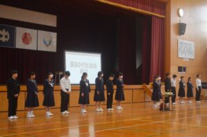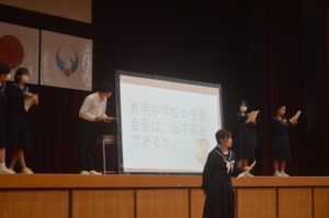 昨日,生徒会入会式・部活動紹介・生徒会交流会が行われました。この日のために,生徒会役員は,春休みを返上して準備を進めてきました。「生徒会入会式」では,生徒会の仕事についての紹介や中学校の生徒会はどのようなものか,わかりやすく説明してくれました。「部活動紹介」では,今年からパフォーマンスをカットして,口頭での説明を行いました。部活動の地域展開が進みつつありますが,完全に移行するまでは,部活動で頑張ってほしいと思います。最後に,有明中生徒会独自の取り組みである「生徒会交流会」が行われました。有明中に関するクイズで,全校生徒大いに盛り上がりました。準備を頑張ってくれた生徒会役員の皆さん,ありがとうございました。