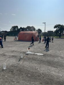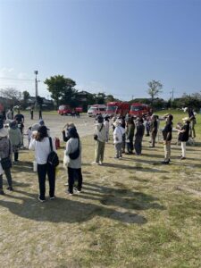 学校に帰ってから,消火器の使い方の説明を受け,実際に消火体験を行いました。小学生や中学生,一般の方まで行いました。また,煙の中を体験するテントも準備され,煙の中をくぐる体験も行いました。また,会場には消防車や救急車なども多数展示され,実際に乗り込む子供も見られました。