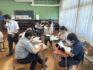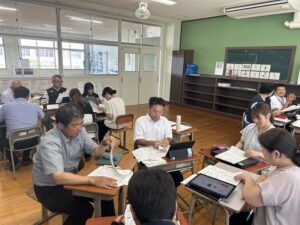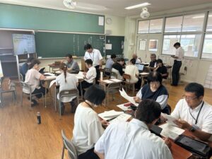 9月1日の午後,職員研修で,県総合教育センター教育相談課の宮本先生をお招きして,人間関係づくりで用いられる「SGE」(構成的グループエンカウンター)と,子どもたちの学校適応感がわかる「学校楽しぃーと」の分析・活用方法について学びました。エクササイズを交えながら,楽しく学べた2時間でした。今回学んだことを活用して,よりより教育ができるように,先生方も頑張っていきます。ご指導いただいた宮本先生,ありがとうございました。