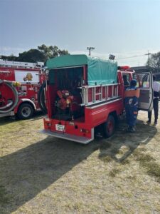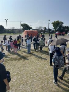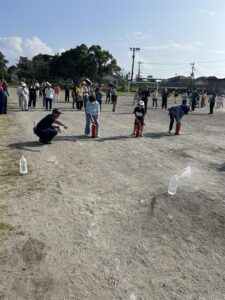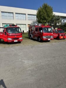 学校に帰ってから,消火器の使い方の説明を受け,実際に消火体験を行いました。小学生や中学生,一般の方まで行いました。また,煙の中を体験するテントも準備され,煙の中をくぐる体験も行いました。また,会場には消防車や救急車なども多数展示され,実際に乗り込む子供も見られました。