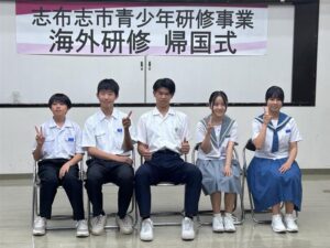 8月27日の18時30分から,志布志市役所志布志庁舎1階の会議室におきまして,志布志市青少年研修事業<国外研修>の合同帰国式が行われました。本校の3年生Fさんも7月25日~8月15日までのアメリカでのホームステイに参加し,今回その感想を英語を交えて発表してくれました。アメリカでの生活について,あるいは分からないことはもう一回言ってもらうようにお願いした工夫などを発表してくれました。将来的には更に長期の留学も考えているようです。是非実現し,国際的な視野を生かした職業に就けることを期待しています。アメリカの話を,本校の生徒にも是非聞かせて下さい。