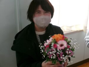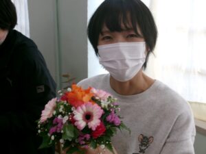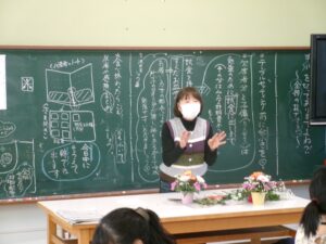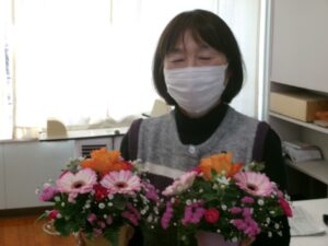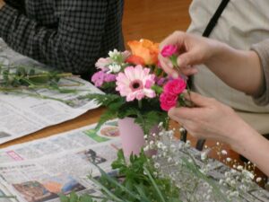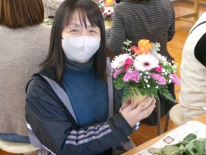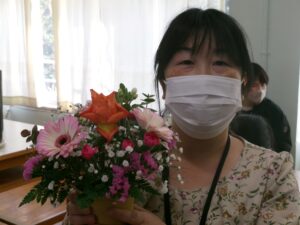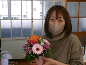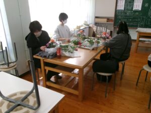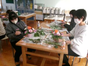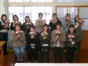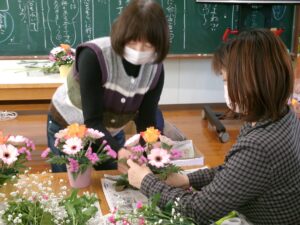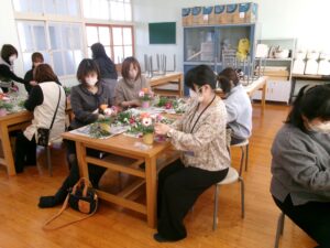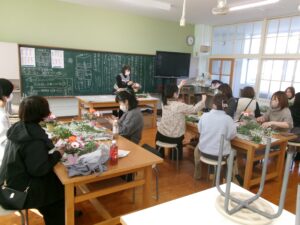 今日の午後は,家庭教育学級でした。今日は,有限会社花熊さんに講師をしていただき,フラワーアレンジメントにチャレンジしました。11名の受講生の皆さんは,先生の指導を仰ぎながら,楽しそうに作品を作りあげていました。みなさん,傑作ができあがったようでした。家に飾って,楽しんでください。