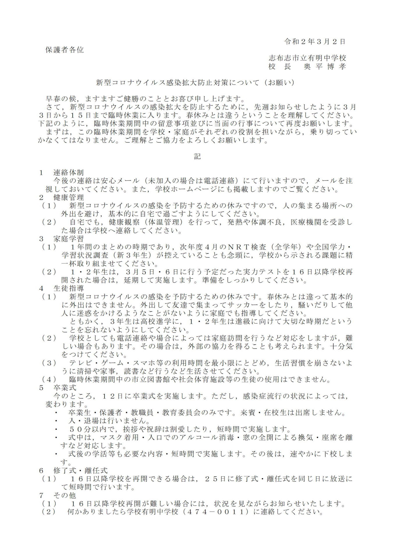 新型コロナウィルス感染症に伴う臨時休業について 及び 臨時休業中の学習課題について