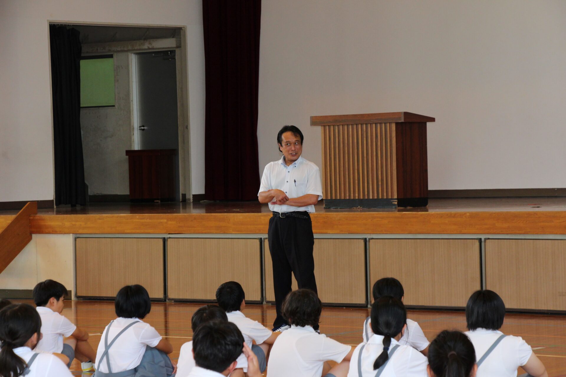 全校朝会では校長先生から夏休みの過ごし方について尋ねられ,楽しい夏休みの思い出を振り返っている姿も見られました。
