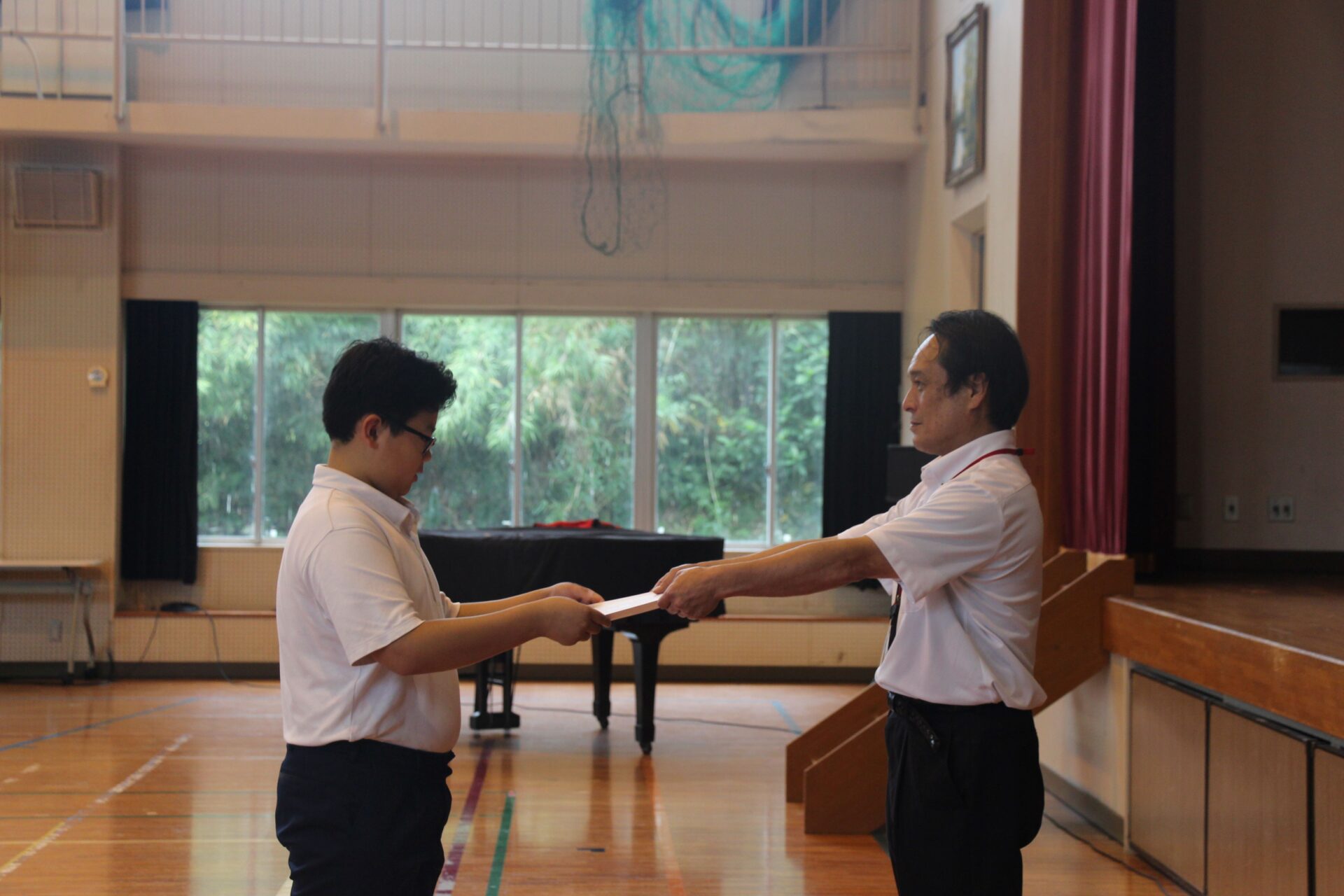 門原先生の紹介の後は,高山やぶさめ際奉納柔道大会で3位に入賞した6年 中村兼慎さんの表彰がありました。「おめでとうございます!!」