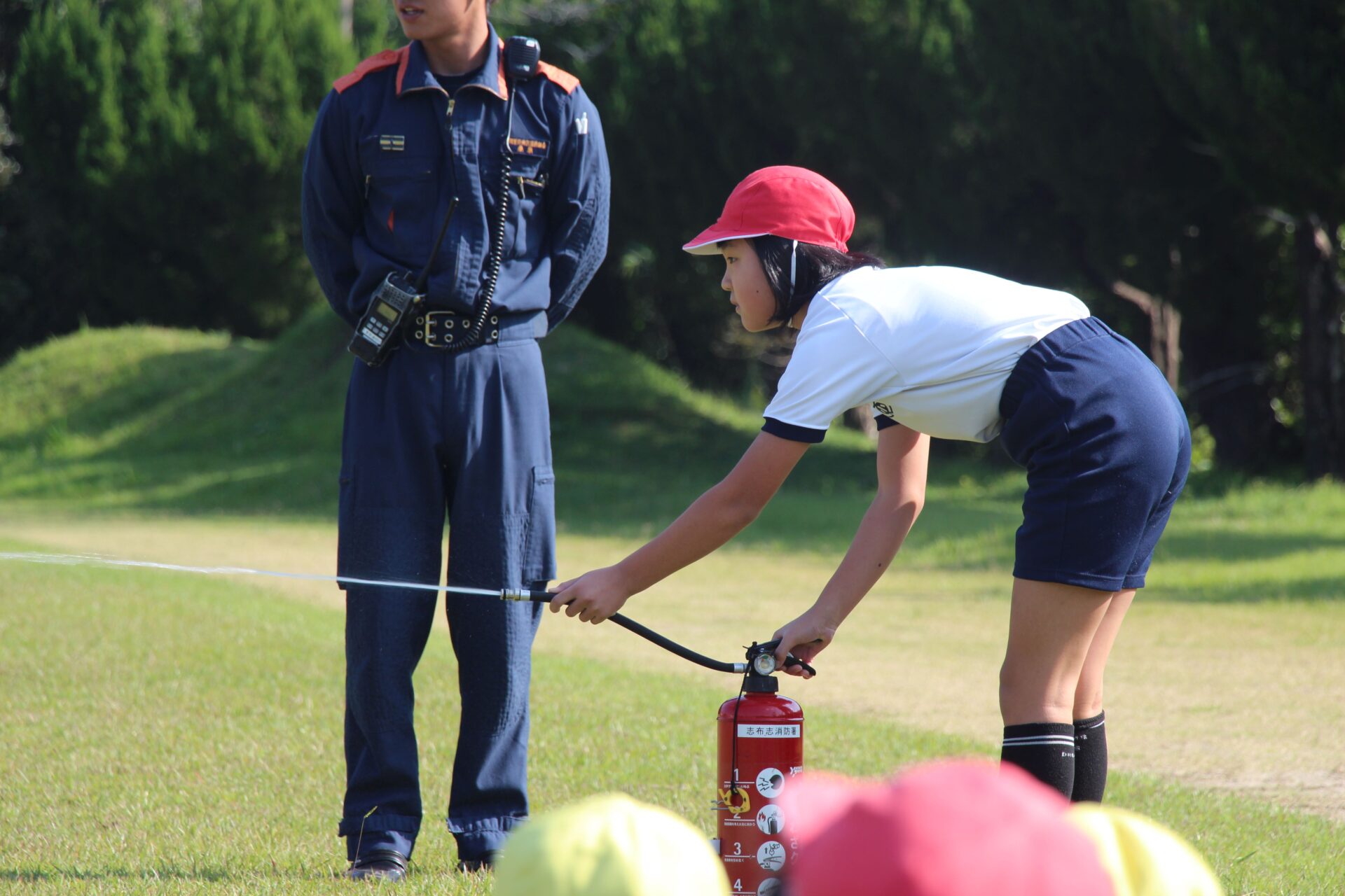 また,桑原さんからは消火方法を学び,3名の児童が代表で消火訓練を行いました。
