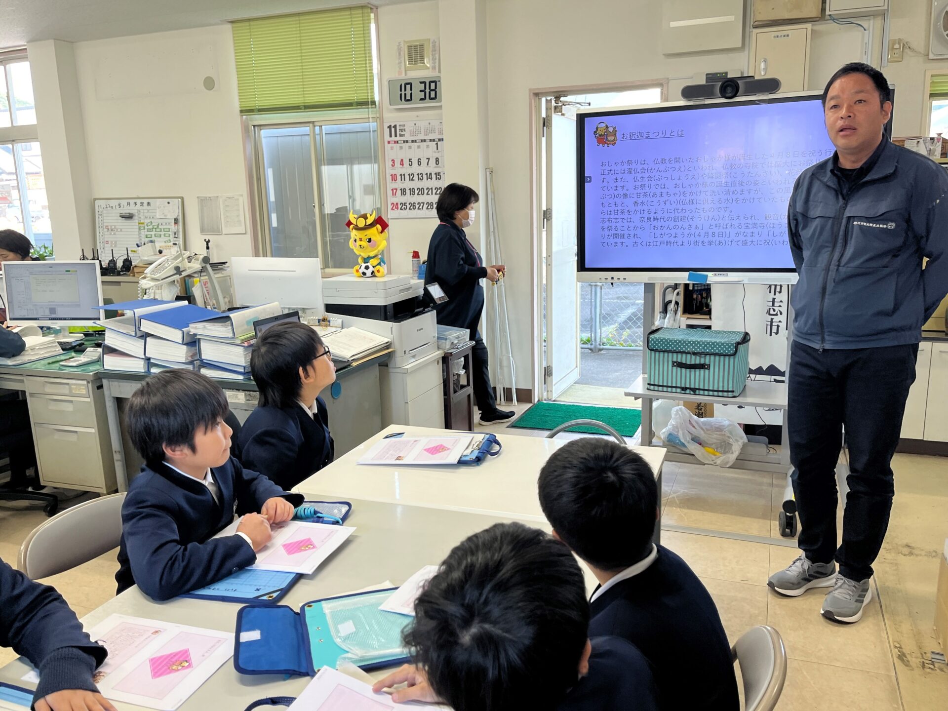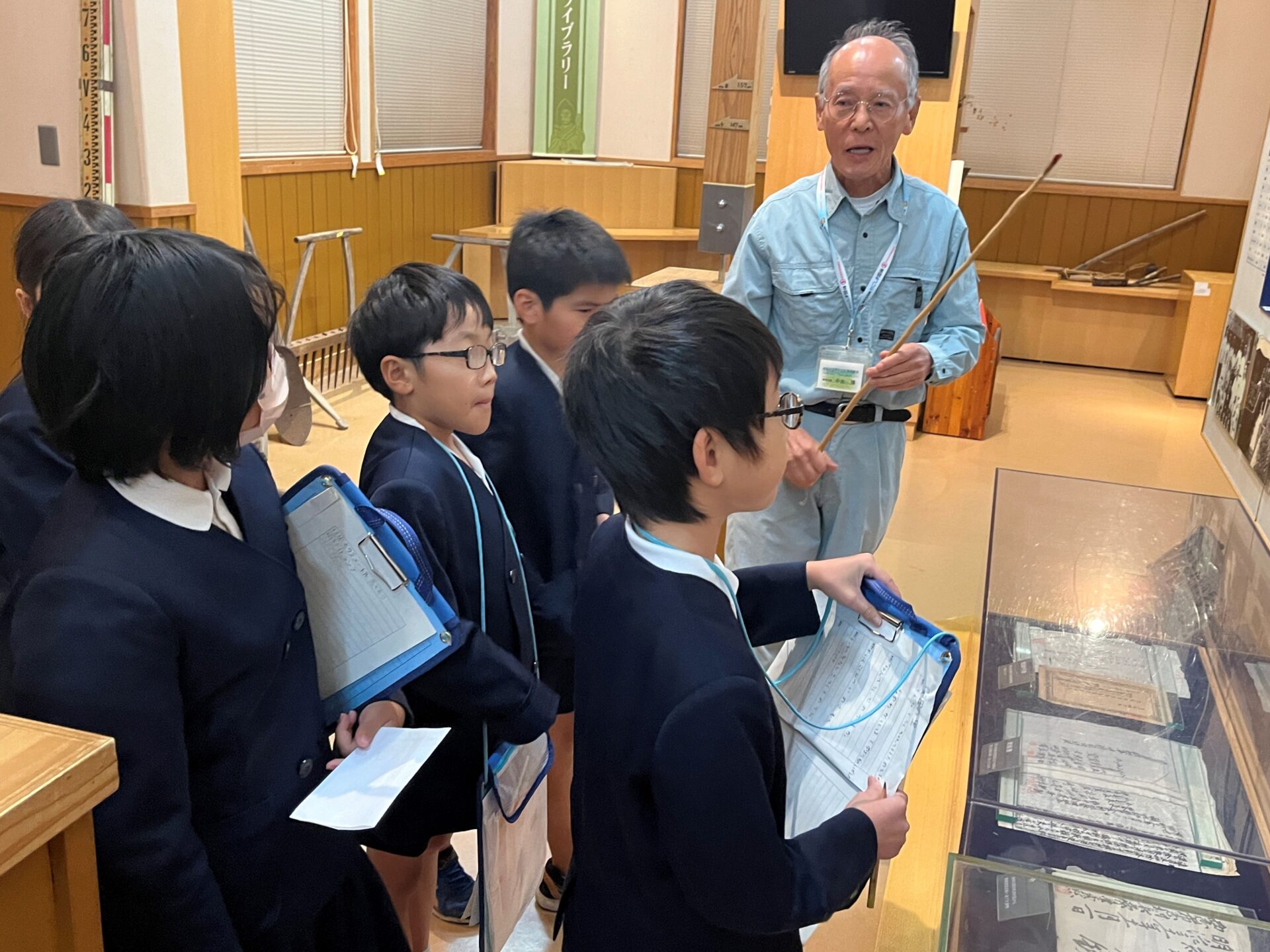 社会の授業で野井倉甚兵衛さんについて学んだ4年生。