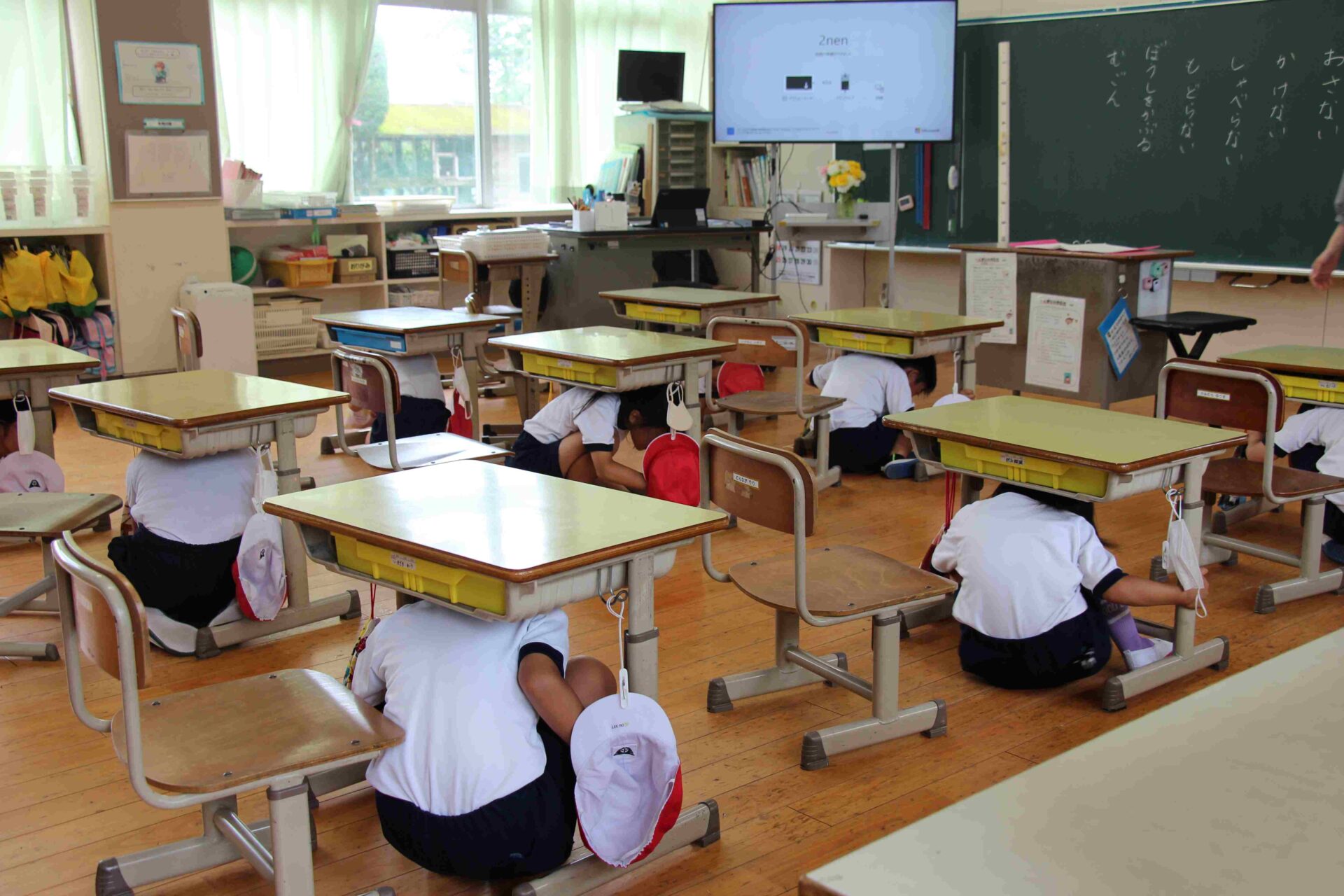 地震発生の放送で机の下にもぐりました。