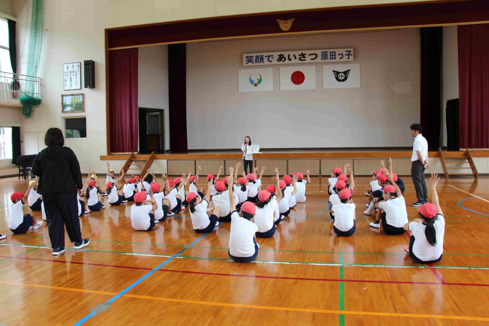 体育館に避難後,防火防災係の平野先生からクイズを交えて,避難の仕方などのお話がありました。